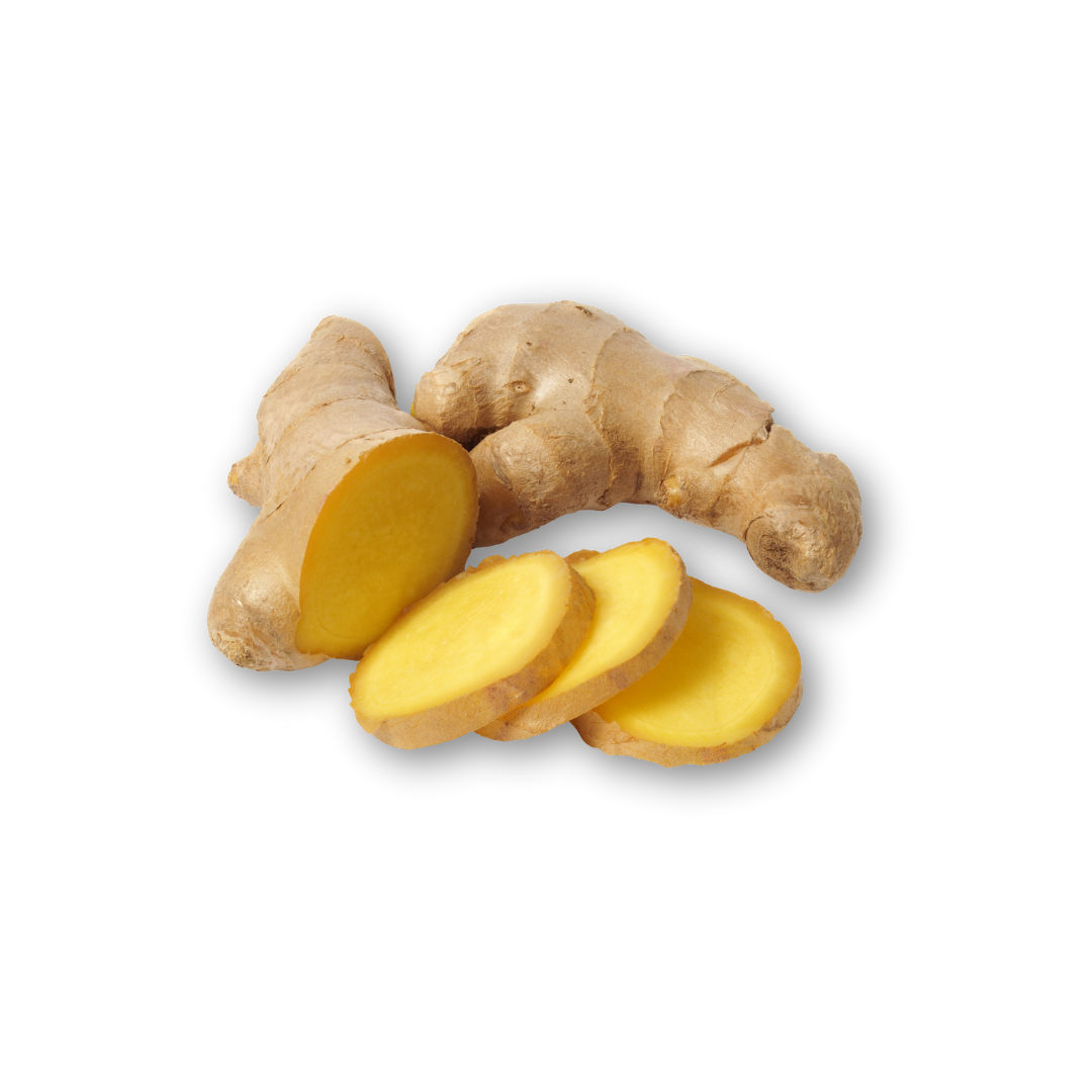 • Gengibre fresco cortado em fatias com casca castanha e interior amarelo