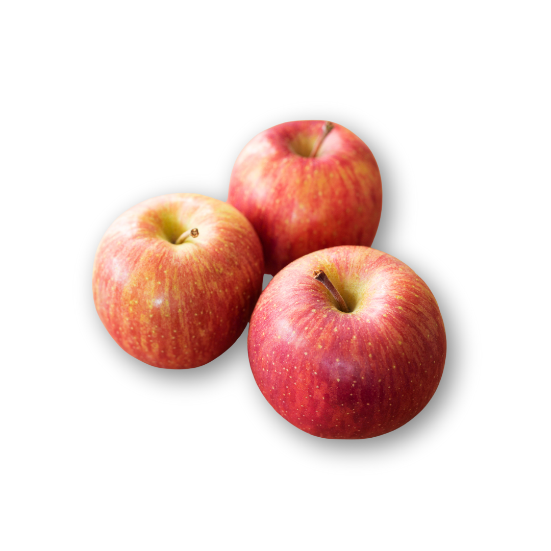 Três maçãs vermelhas com tons amarelos sobre fundo branco