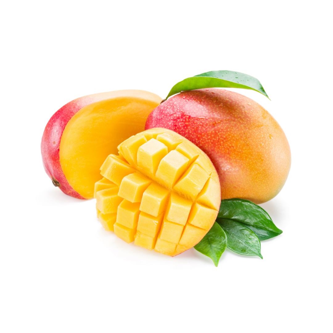 Três mangas com uma cortada em cubos e folhas verdes sobre fundo branco